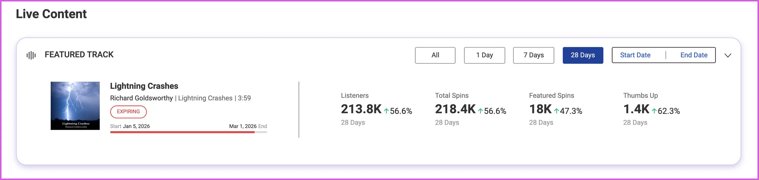 For the first time ever, we are lifting the 365 day eligibility window for Featured Tracks! Artists have long requested the ability to feature catalog tracks and not just new releases. We’ve heard your feedback and are very excited to announce you’ll now be able to feature any track in your catalog, as long as it meets the spin requirements and has not been featured before. As always, each individual artist profile will be able to feature up to 6 tracks per year.