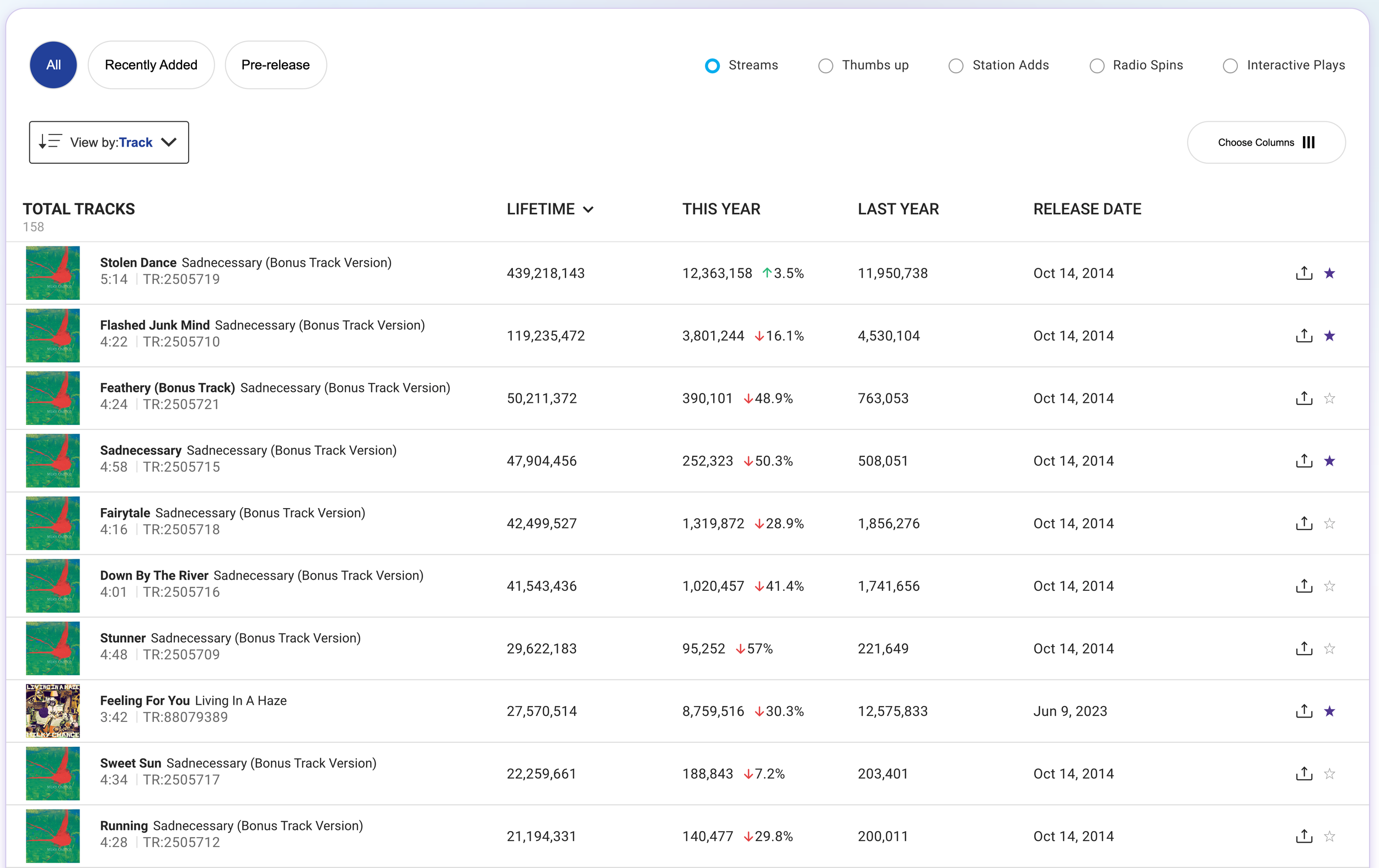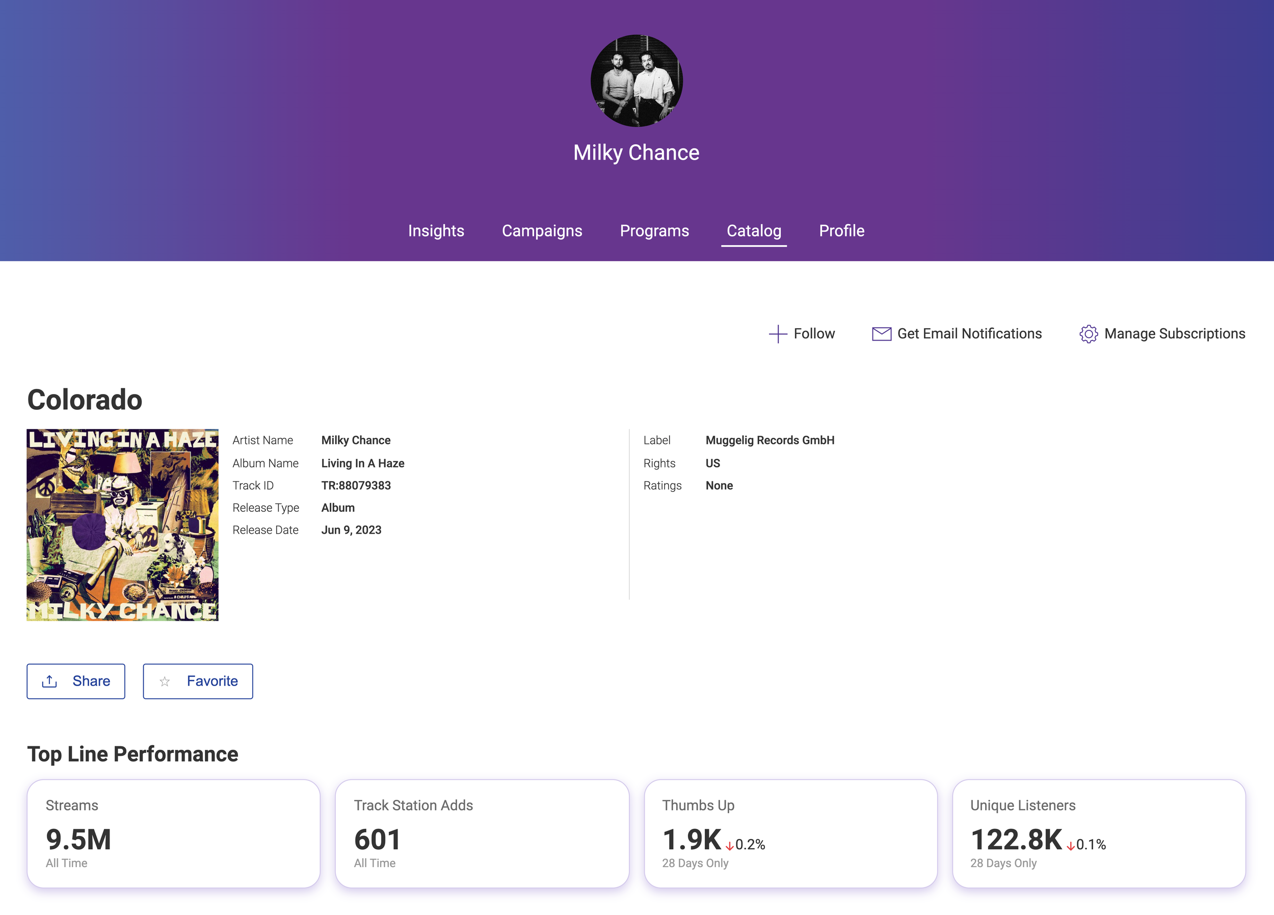 Click on a track, and it will open a details page specifically designed for that track. The details page displays high level data (streams, station adds, thumbs and unique listeners):