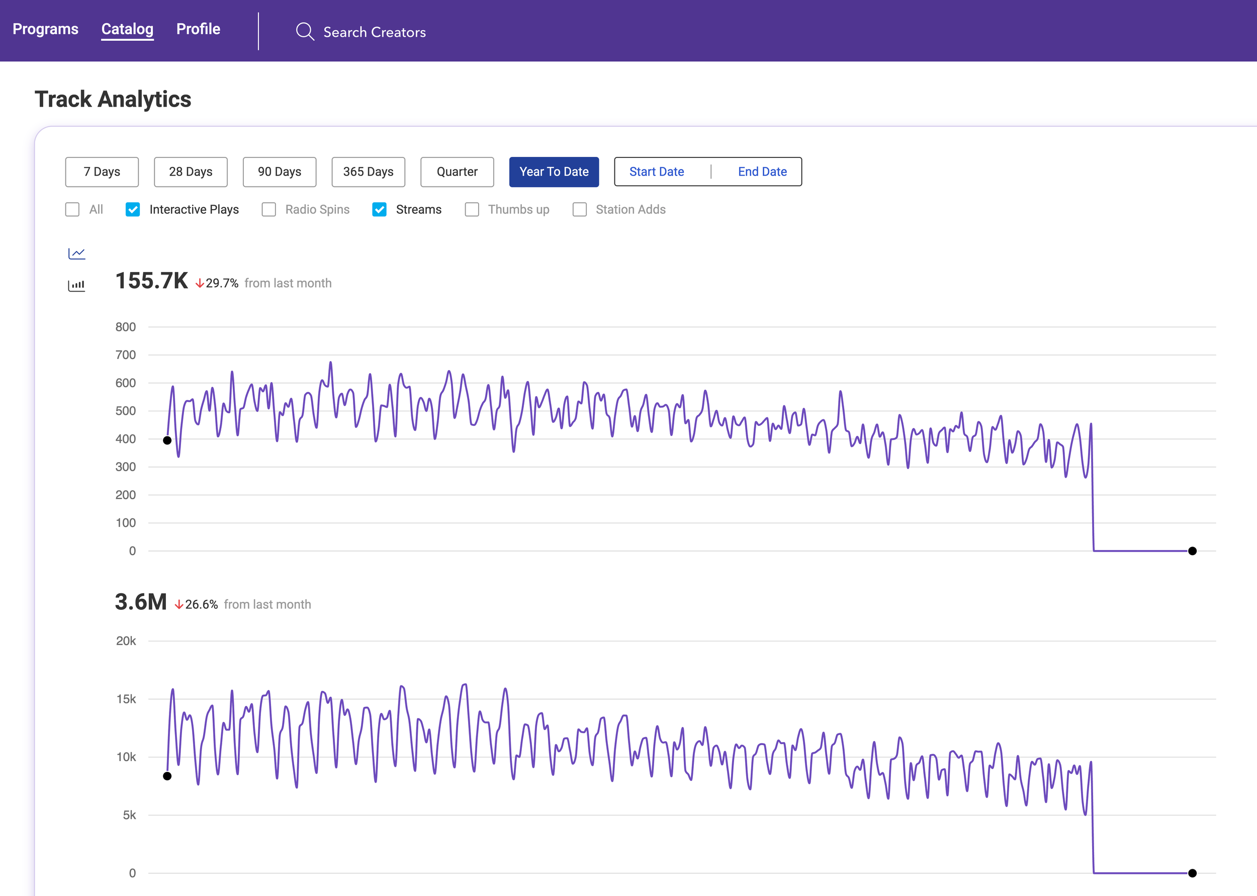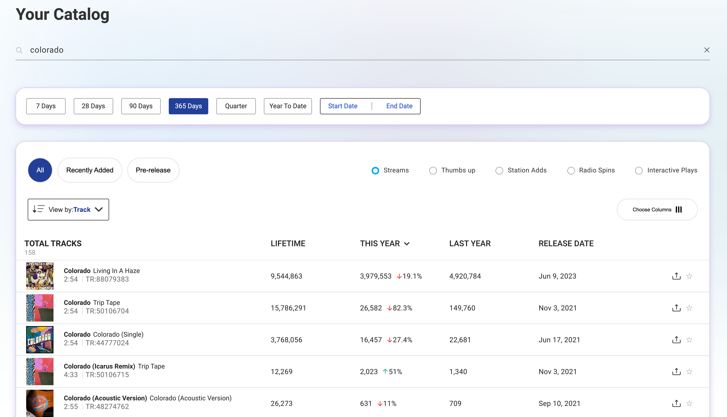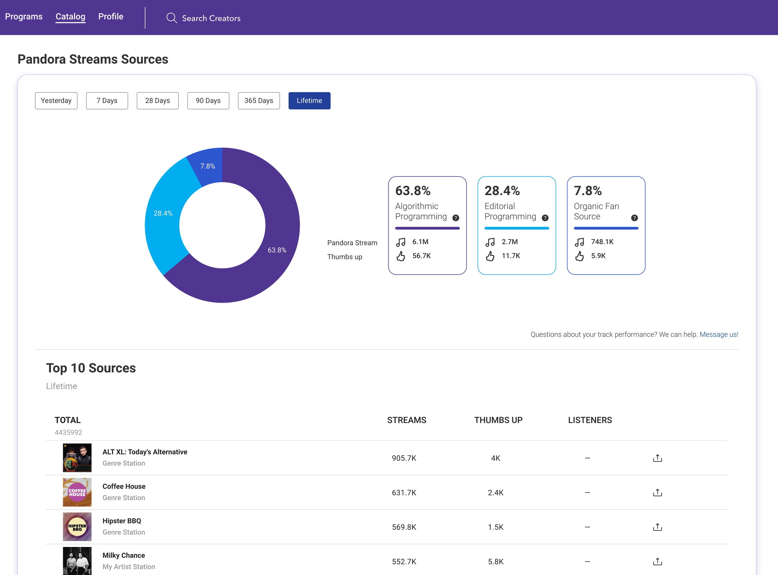 The Catalog tab hosts a powerful AMP feature, Track Reporting, which offers the most comprehensive insight into a track’s performance on Pandora that has ever been available. AMP users with access to an artist page can see total Streams, Radio Spins, Interactive Plays, Station Adds, and Thumbs Up for each track they have that is on Pandora.