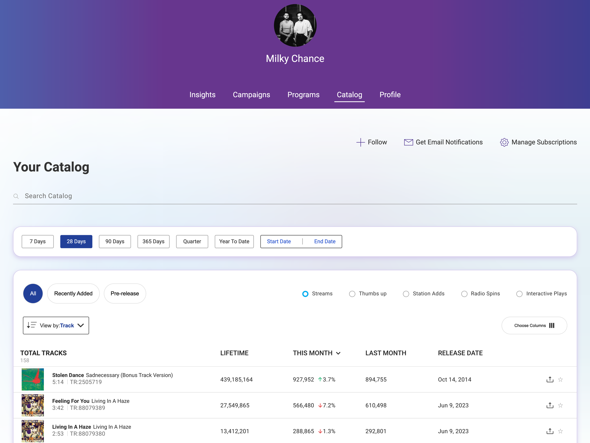 Navigate to the Catalog tab and you’ll see the tracks you have spinning on Pandora. Also displayed will be lifetime streams, streams this month and last month, the release date, percent change, a share link, the ability to favorite the track for easy access. You’ll also have a set of filtering options that include recently added, pre-release, view by track group, track or album and the ability to choose between streams, thumbs up, station adds, radio spins and interactive plays.